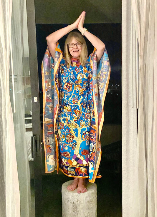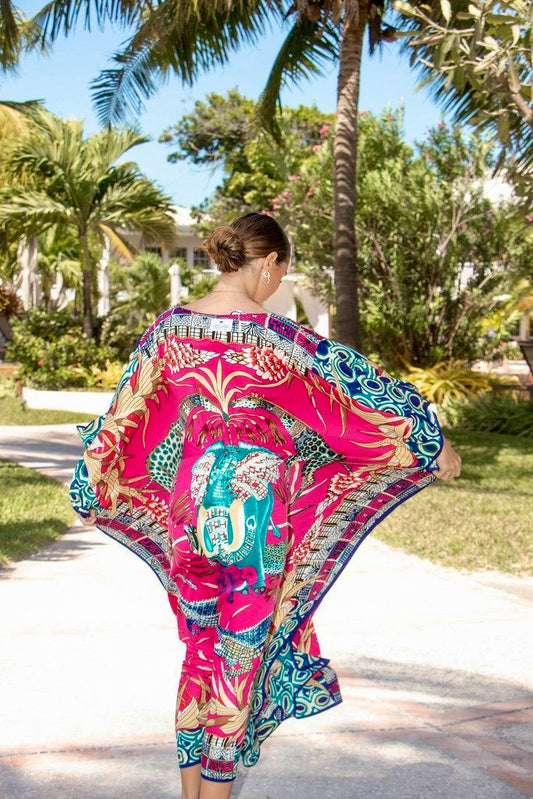 Dramatic. Lush. A true statement piece. The Mystic Blossom caftan is a wearable work of art, bursting with kaleidoscopic florals in vivid fuchsia, sapphire blue, jade green and fiery coral. Its intricate mirrored design draws the eye to the center, radiating out like a tropical mandala of petals and leaves. Handcrafted in Belize from fluid 100% silk, it drapes with effortless elegance, moving like a breeze through palm fronds. And yes! It is completely machine-washable, making luxury as easy as it is beautiful. Ideal for cocktail hours by the sea, gallery openings, or simply making an entrance, this caftan pairs beautifully with metallic sandals and delicate jewelry because the print speaks volumes all on its own.