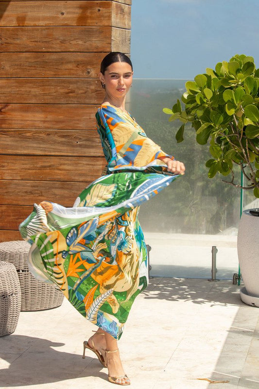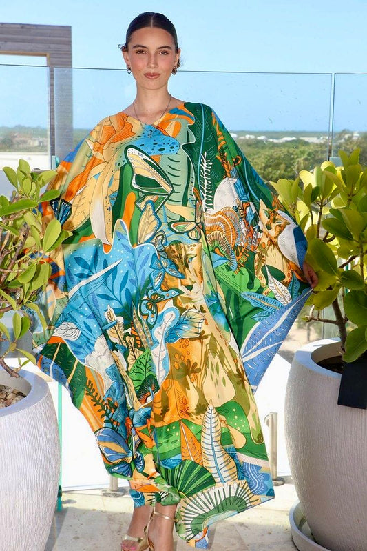 Bold yet graceful, Jaguar Garden captures the untamed beauty of the tropics in full bloom. Lush emerald leaves, golden orchids, and vibrant butterflies surround a hidden jaguar, the symbol of quiet strength and feminine power. Crafted in our signature eco-friendly, machine-washable silk, this caftan drapes effortlessly over every body, offering movement, comfort, and timeless elegance. The rich palette of greens, teals, and sunlit oranges makes it equally striking poolside, at a seaside dinner, or layered for an evening gathering. Like all Caye Caftans, Jaguar Garden is designed to be worn often, loved long, and styled your way. It’s a statement piece that feels both artful and effortless. It is a celebration of nature, confidence, and individuality.