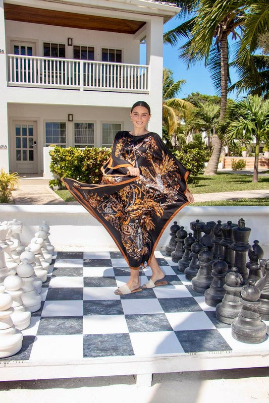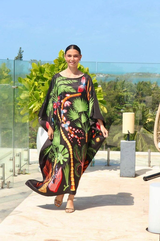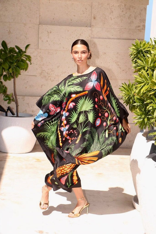 Step into a world of mystery and botanical beauty with the Dark Tropics caftan – a masterpiece of nature-inspired design and effortless sophistication. This luxurious caftan is crafted from 100% washable silk, draping beautifully over the body for an ethereal, flowing silhouette that exudes grace and confidence. Set against a deep midnight black backdrop, the intricate illustration of tropical palms, exotic flowers and lush greenery comes to life in vivid shades of emerald, tangerine and sky blue. Each botanical detail is meticulously designed, evoking the untouched beauty of an enchanted jungle at dusk. The striking contrast of vibrant foliage against the dark background adds a touch of drama, making this caftan an unforgettable statement piece. So, whether you're lounging by the beach, strolling through a resort or hosting an elegant evening dinner, this silk caftan is the epitome of chic versatility. Breezy, breathable and irresistibly soft, it offers unparalleled comfort while ensuring you stand out in any setting. Embrace the mystery. Wear the magic. This caftan is one where luxury truly meets the wild.