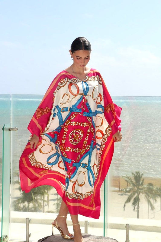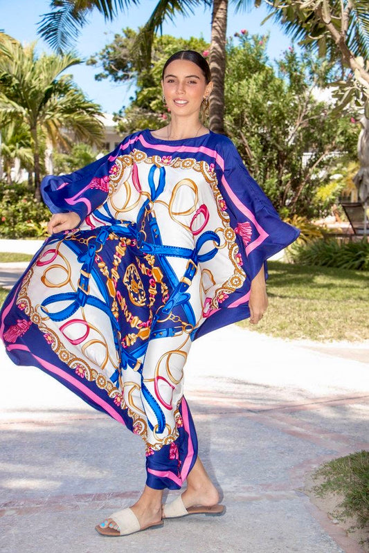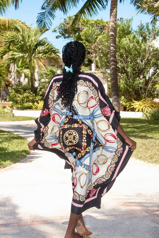 Step into effortless luxury with our Belted Elegance caftan - a 100% silk masterpiece handcrafted in Belize. This stunning design features a mesmerizing pattern of intertwined belts and golden chains, symbolizing strength, sophistication, and timeless femininity. The rich hues and intricate details create an air of refined allure, while the smooth silk glides beautifully over your skin, offering a flattering, graceful flow with every movement.