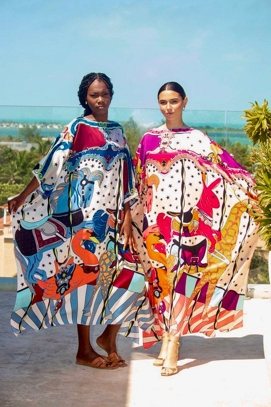 Step right into a whimsical carnival with this playful dress, featuring a stunning carousel-inspired pattern that's bursting with charm and nostalgia. The vibrant design showcases intricately adorned carousel animals, all brought to life against a star-studded backdrop. Whether you're strolling through a festival, attending a quirky brunch or simply bringing a sense of fun to your day, this dress is your ticket to being the life of the merry-go-round. Prepare for endless compliments as you twirl through life's adventures in this wearable work of art! Made from 100% silk twill, this caftan is available in two colors and is completely machine-washable.