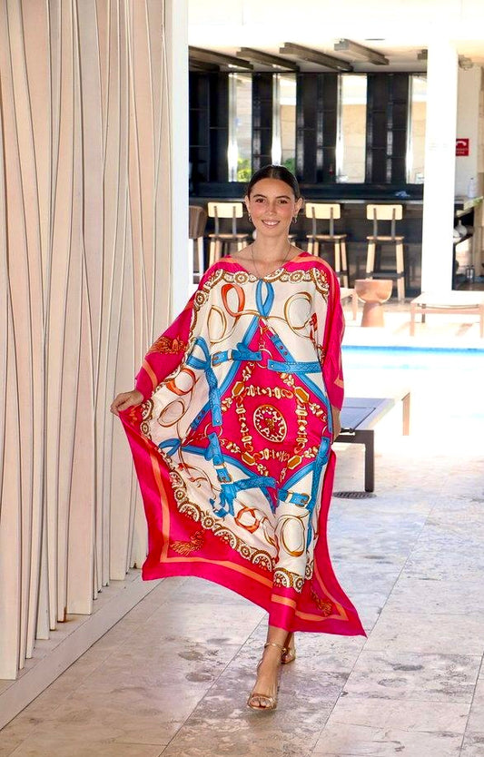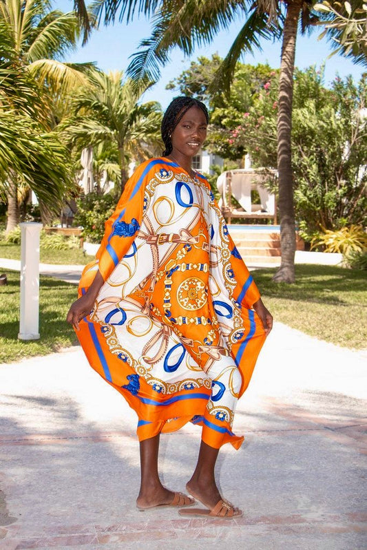 Available in black, blue, orange or pink, this caftan brings both elegance and ease to your wardrobe. Made from machine-washable silk, it’s designed for women who desire luxury without compromise, perfect for tropical getaways, seaside brunches, or glamorous evenings under the stars.