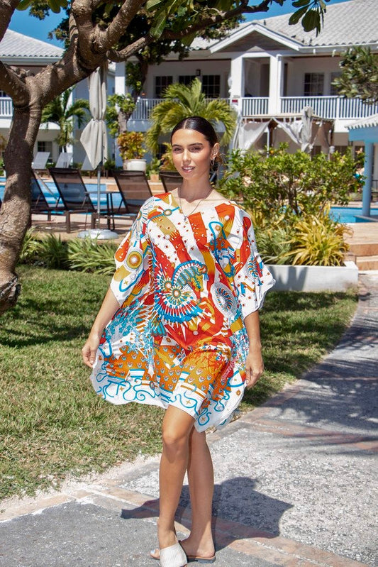 This knee-length caftan is a wearable work of art, crafted from 100% pure silk and showcasing a mesmerizing, kaleidoscopic pattern inspired by the bold, energetic spirit of 1960s pop art. The design bursts to life with dynamic swirls of red, orange, and electric blue, radiating from a central motif reminiscent of a soaring, mythical Pegasus. Handcrafted in Belize, this caftan captures a sense of movement and joy - a perfect blend of retro vibrancy and modern sophistication. Its fluid silk drape flatters every silhouette, while the lightweight fabric feels luxurious against the skin. Both statement-making and effortless, it transitions beautifully from a day by the sea to an evening soirée. And best of all, it’s machine-washable, making glamour as easy as it is striking.