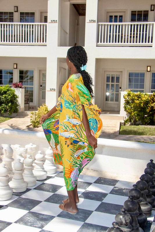 Immerse yourself in the vibrant spirit of the country of Belize with this striking 100% silk caftan. Showcasing a breathtaking design, this piece is a celebration of the country's rich culture and lush biodiversity. A majestic Mayan temple stands at the heart of the print, surrounded by a tropical paradise bursting with crimson hibiscus, emerald-green palms, and fiery exotic flora. Toucans, sea turtles, and a dazzling underwater scene add depth and intrigue, while a proud Garifuna figures and playful tapir complete the storytelling. This caftan is crafted from lightweight, breathable fabric and is machine-washable, making it perfect for island adventures, holiday celebrations, casual outings, or making a bold, sophisticated statement. It pairs perfectly with our matching men's shirt (available in sizes small to 3XL) or is available in a hip-length tunic.