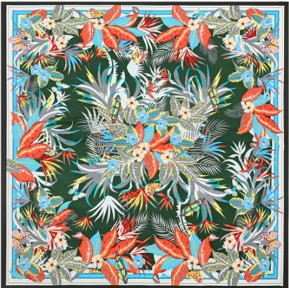 Infuse your wardrobe with vibrant energy in this tropical-inspired short-sleeved shirt. Featuring a lush botanical design set against your choice of a bold black or a sky-blue backdrop, this piece bursts with fiery orange foliage, vivid green palm fronds and delicate hibiscus blooms. Playful butterflies and intricate detailing add a sense of movement, making this shirt a statement of effortless island sophistication. Crafted from lightweight, breathable 100% silk, it is perfect for sun-drenched getaways, rooftop parties or simply adding a tropical flair to your everyday style. Completely machine-washable and it is available in sizes from Small to 3XL. Pairs perfectly with our long caftan or tunic for couple's photo shoots or wedding parties.