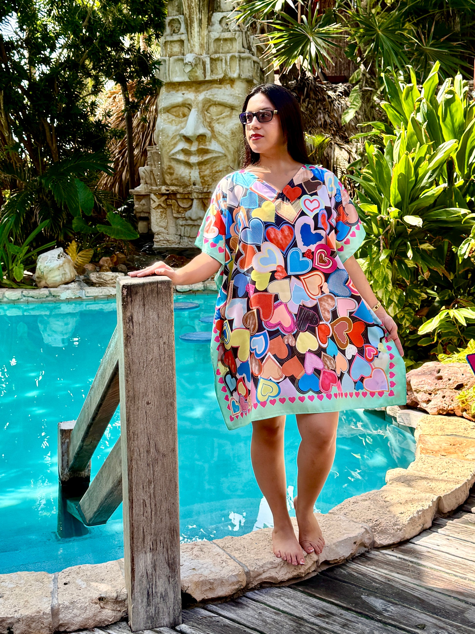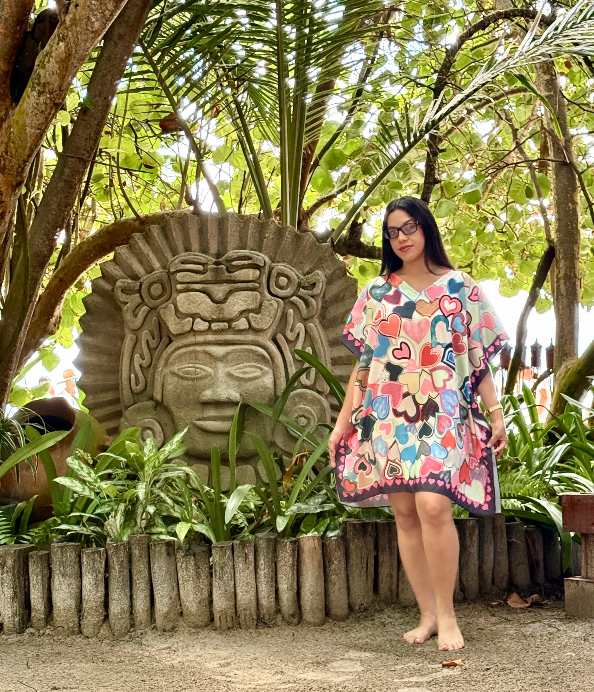Sumérgete en el vibrante espíritu del país de Belice con este llamativo caftán 100 % de seda. Con un diseño impresionante, esta pieza es una celebración de la rica cultura y la exuberante biodiversidad del país. Un majestuoso templo maya se encuentra en el centro del estampado, rodeado de un paraíso tropical repleto de hibiscos carmesí, palmeras verde esmeralda y una flora exótica ardiente. Los tucanes, las tortugas marinas y una deslumbrante escena submarina añaden profundidad e intriga, mientras que unas orgullosas figuras garífunas y un tapir juguetón completan la narración. Este caftán está confeccionado con tela ligera y transpirable y se puede lavar a máquina, lo que lo hace perfecto para aventuras en la isla, celebraciones navideñas, salidas informales o para hacer una declaración audaz y sofisticada.