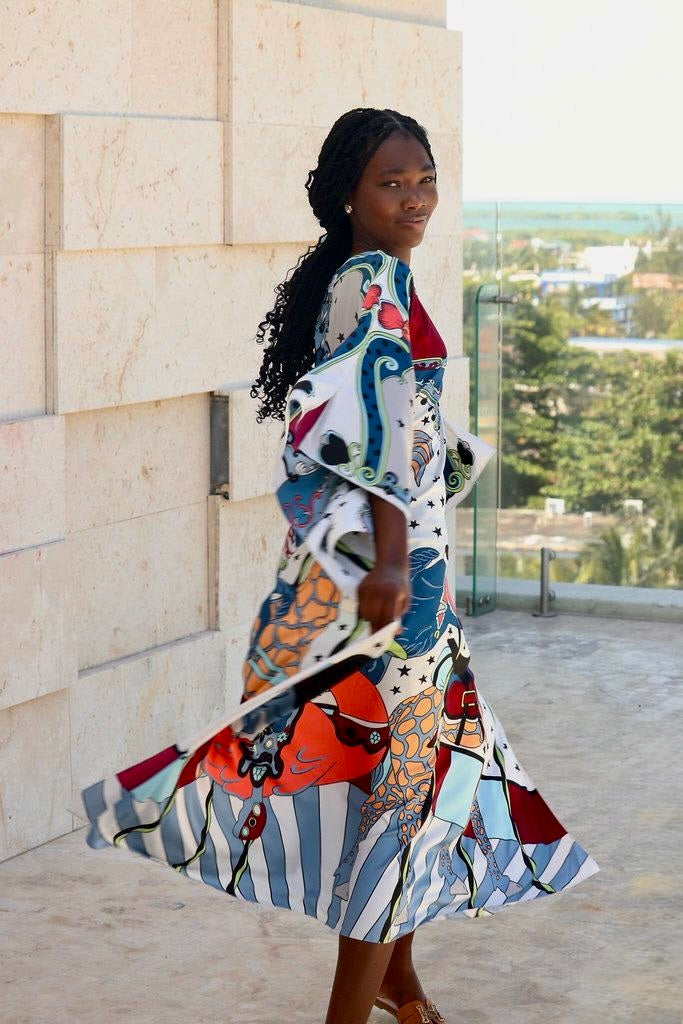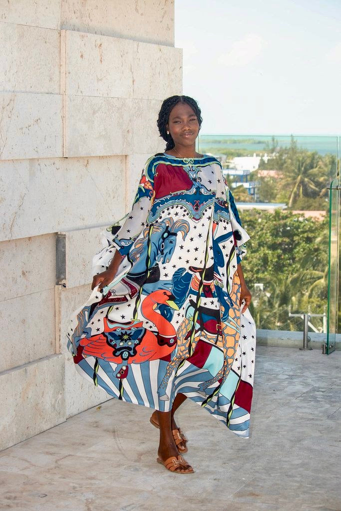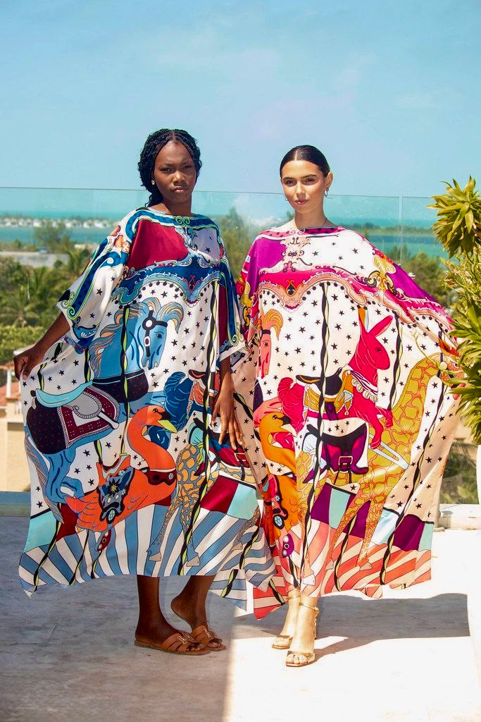 Entra en un carnaval extravagante con este vestido divertido, que presenta un patrón impresionante inspirado en un carrusel que rebosa de encanto y nostalgia. El diseño vibrante muestra animales de carrusel intrincadamente adornados, todos cobran vida contra un fondo repleto de estrellas. Ya sea que estés paseando por un festival, asistiendo a un brunch peculiar o simplemente aportando un toque de diversión a tu día, este vestido es tu boleto para ser el alma del tiovivo. ¡Prepárate para recibir un sinfín de cumplidos mientras recorres las aventuras de la vida con esta obra de arte ponible! Hecho de sarga de seda 100 %, este caftán está disponible en dos colores y es completamente lavable a máquina.