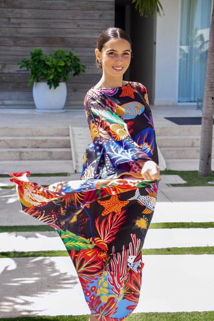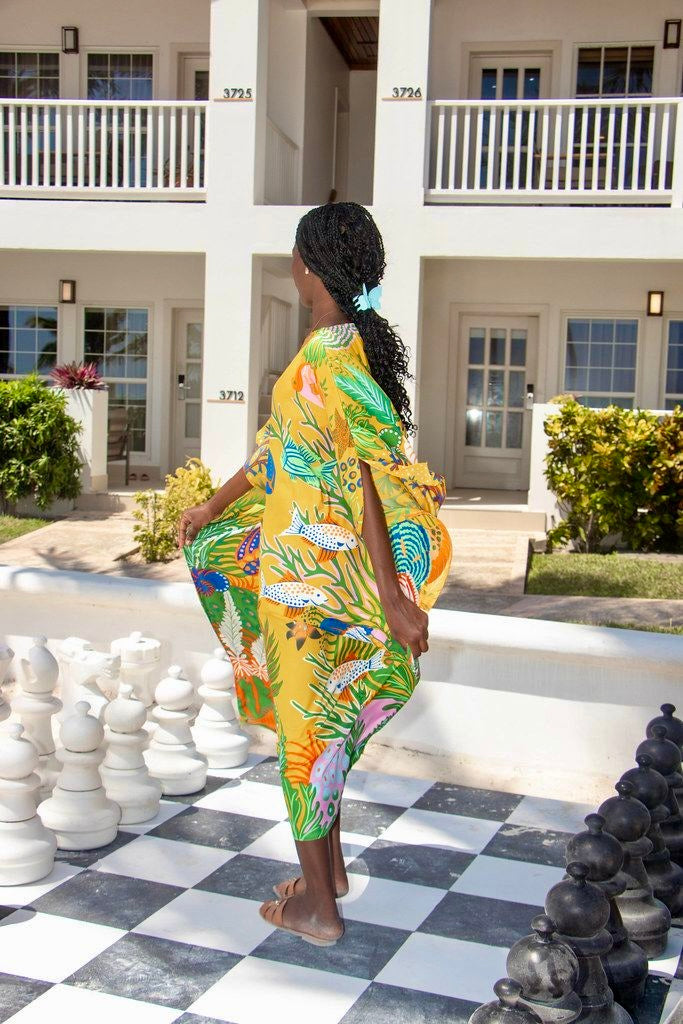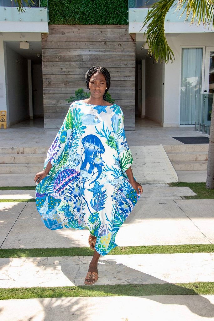 Sumérgete en la impresionante belleza de un arrecife de coral con este impresionante caftán. Los colores intensos y vibrantes capturan los fascinantes matices del océano a medida que el sol se esconde en el horizonte, envolviéndote en un resplandor radiante y de ensueño. Perfecto para quienes anhelan un toque de encanto oceánico en su guardarropa, este caftán es un vibrante homenaje a los momentos más encantadores de la naturaleza. Disponible en tres colores, este caftán liviano y aireado está confeccionado en sarga de seda 100 % y es completamente lavable a máquina. ¡También combina perfectamente con nuestras camisas Coral Reef para hombres para sesiones de fotos de pareja o fiestas de bodas!