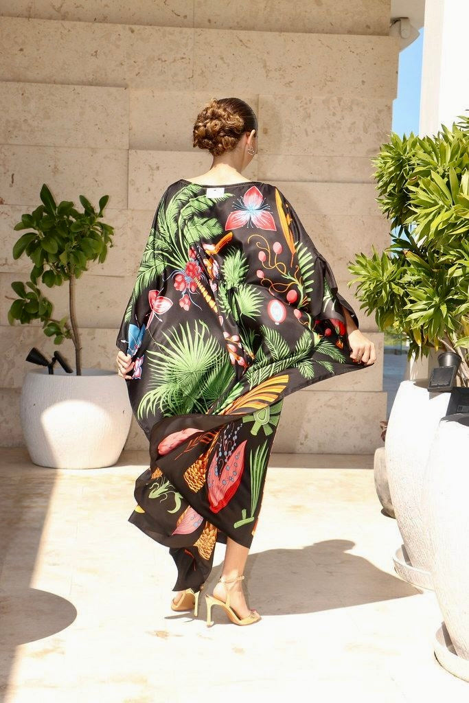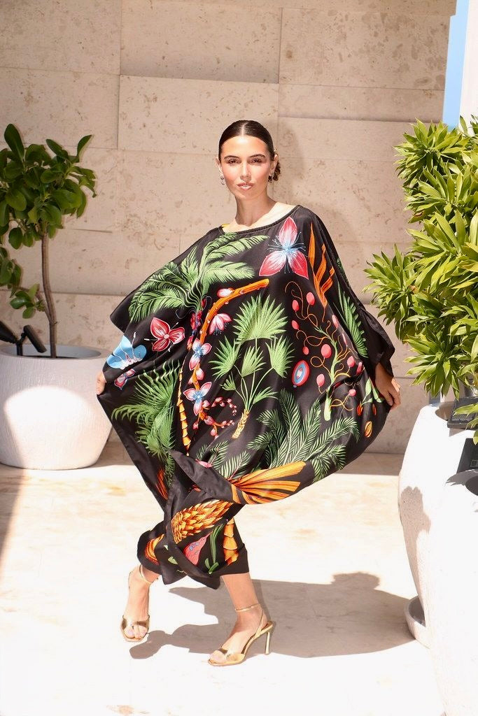 Destaca en cualquier evento o situación con este caftán fresco con un diseño encantador de plantas y frutas tropicales extravagantes sobre un elegante fondo negro. Este hermoso vestido, totalmente lavable a máquina, está confeccionado en sarga de seda 100 %.