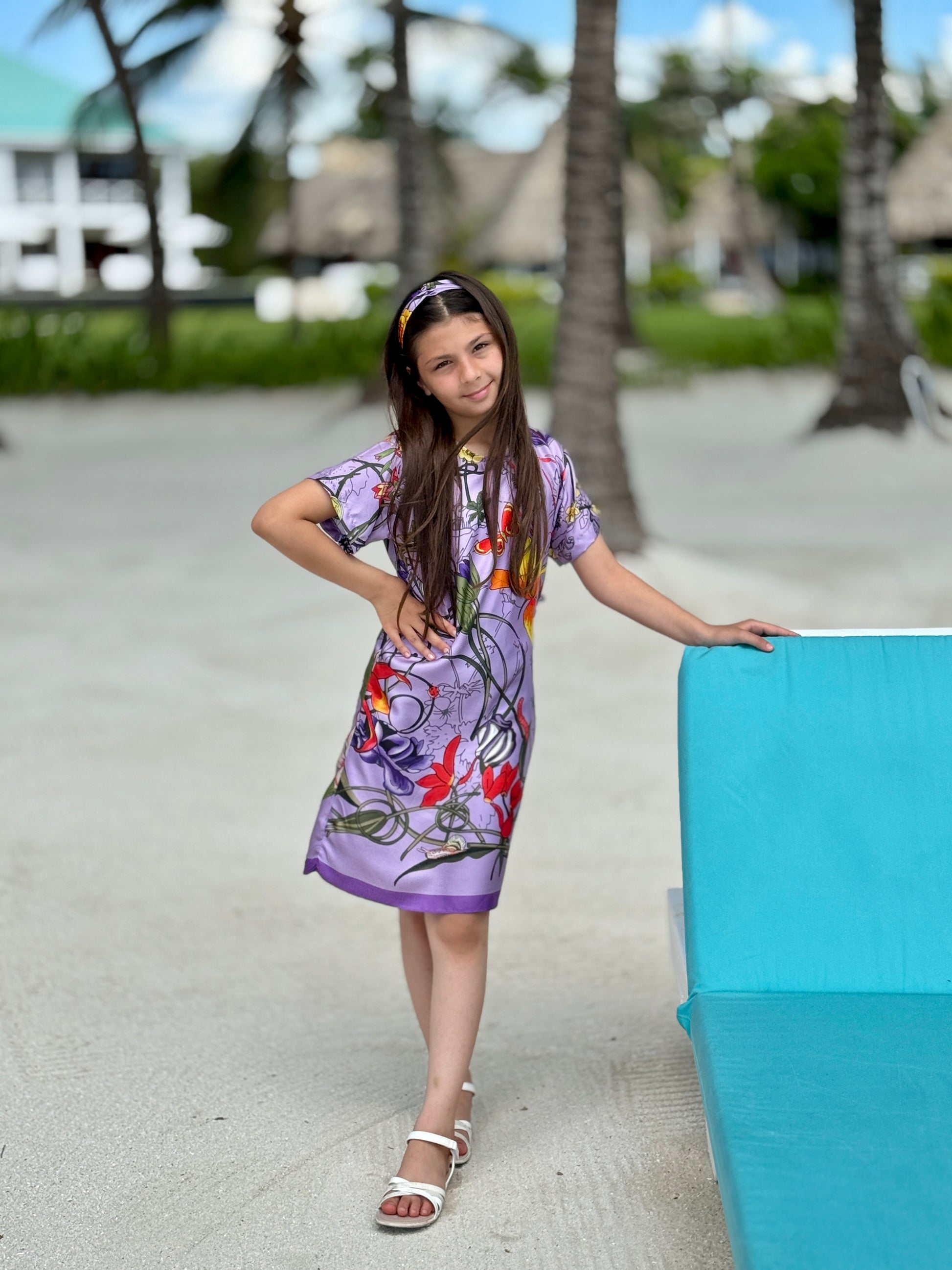 Este vestido es una celebración de la elegancia de la naturaleza, con un fondo azul pastel que sirve como un lienzo sereno para una vibrante maraña de flores y enredaderas. El intrincado diseño estalla con tonos vivos de rojo, amarillo, violeta y verde, evocando el encanto de un jardín floreciente besado por la luz del sol. Mariposas y mariquitas caprichosas revolotean y revolotean por todo el detallado motivo botánico, agregando un toque divertido pero refinado. Hecho de sarga de seda 100 %, este hermoso vestido está disponible en tres colores y es completamente lavable a máquina.