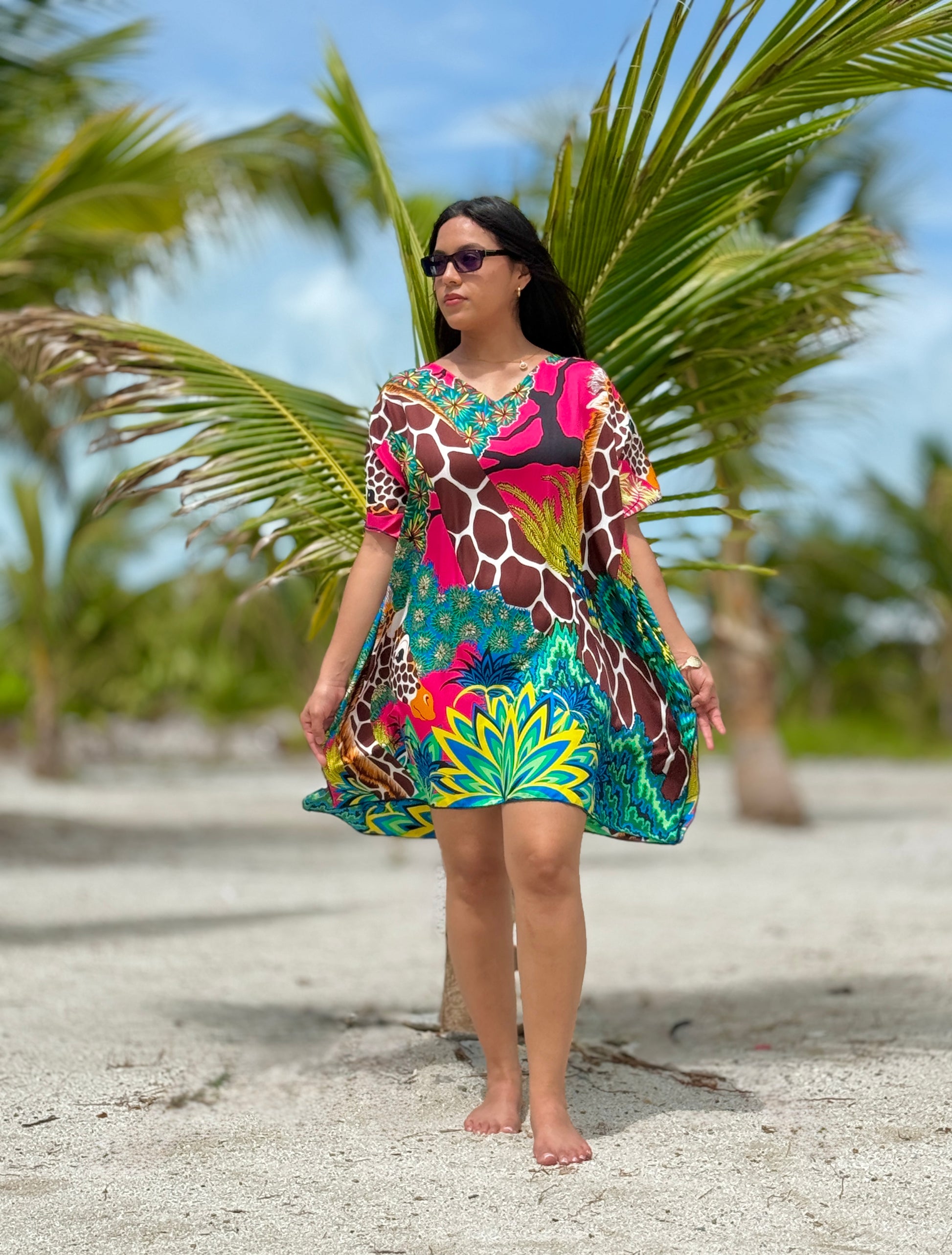 Sumérgete en el vibrante espíritu del país de Belice con este llamativo caftán 100 % de seda. Con un diseño impresionante, esta pieza es una celebración de la rica cultura y la exuberante biodiversidad del país. Un majestuoso templo maya se encuentra en el centro del estampado, rodeado de un paraíso tropical repleto de hibiscos carmesí, palmeras verde esmeralda y una flora exótica ardiente. Los tucanes, las tortugas marinas y una deslumbrante escena submarina añaden profundidad e intriga, mientras que unas orgullosas figuras garífunas y un tapir juguetón completan la narración. Este caftán está confeccionado con tela ligera y transpirable y se puede lavar a máquina, lo que lo hace perfecto para aventuras en la isla, celebraciones navideñas, salidas informales o para hacer una declaración audaz y sofisticada.