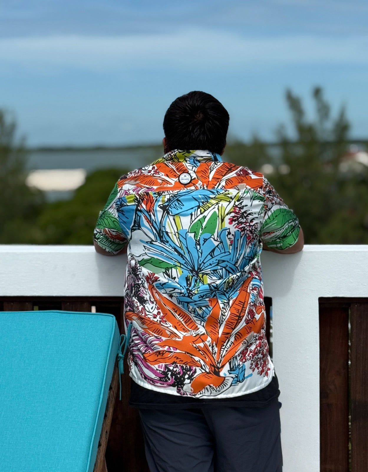 Make a bold statement with this men’s shirt that captures the wild beauty of the tropics. A lush jungle scene unfolds in a riot of color with brilliant turquoise palms, bursts of orange and fuchsia blooms and even a graceful giraffe, parrot and zebra peeking through the foliage. The sketch-style artistry gives it a hand-drawn, couture feel, while the bold orange border frames the design with confidence. Crafted from 100% silk twill and completely machine-washable, it combines luxury with ease for a look that’s both elevated and effortless. Perfect for resort dinners, art openings, or simply bringing a pop of paradise to your everyday, this men’s shirt also has matching caftans available - for those who love to coordinate in high style. Available in sizes S-3XL and pairs perfectly with the Jungle Queen long or short caftan.